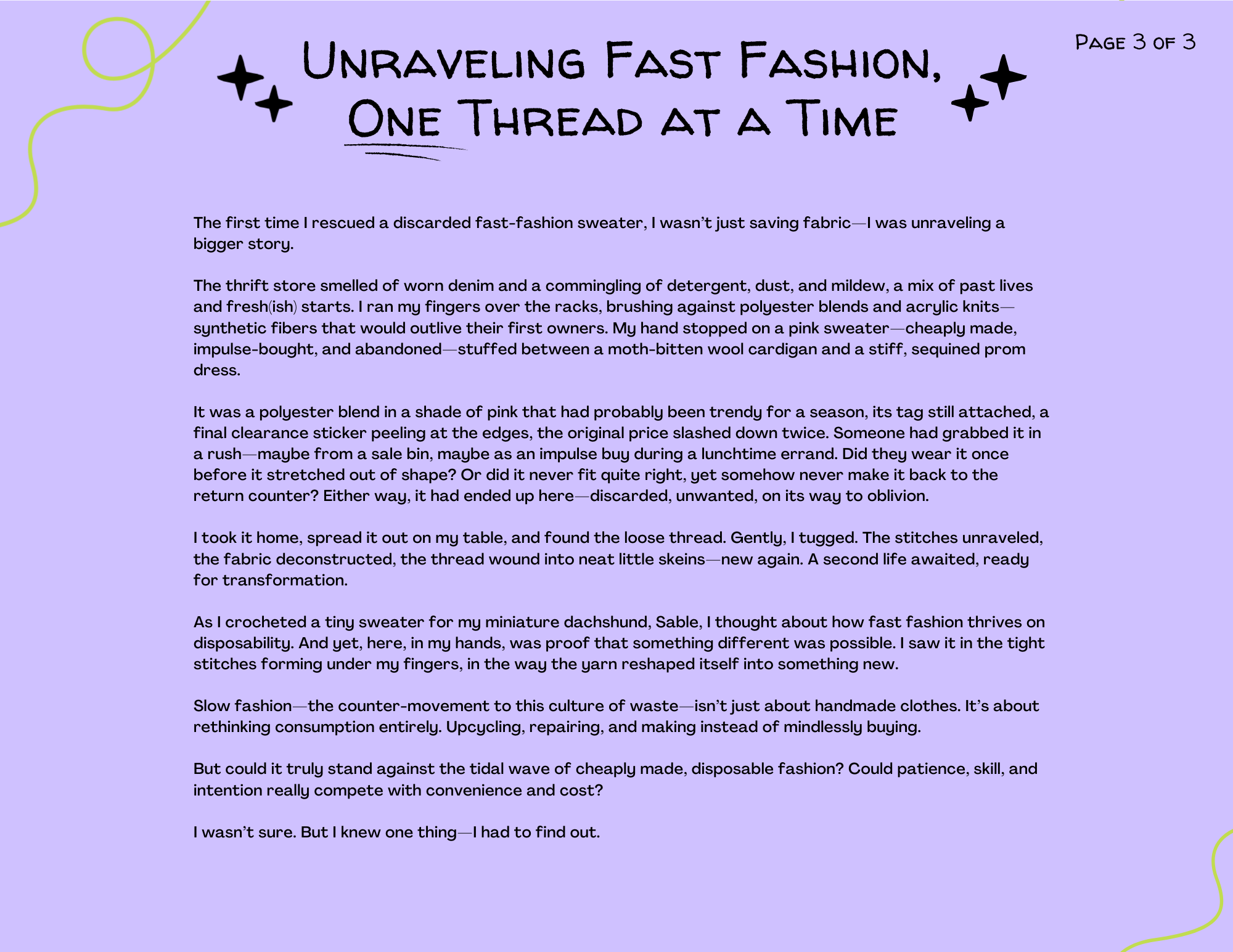 As I crocheted a tiny sweater for my miniature dachshund, Sable, I thought about how fast fashion thrives on disposability. And yet, here, in my hands, was proof that something different was possible. I saw it in the tight stitches forming under my fingers, in the way the yarn reshaped itself into something new.