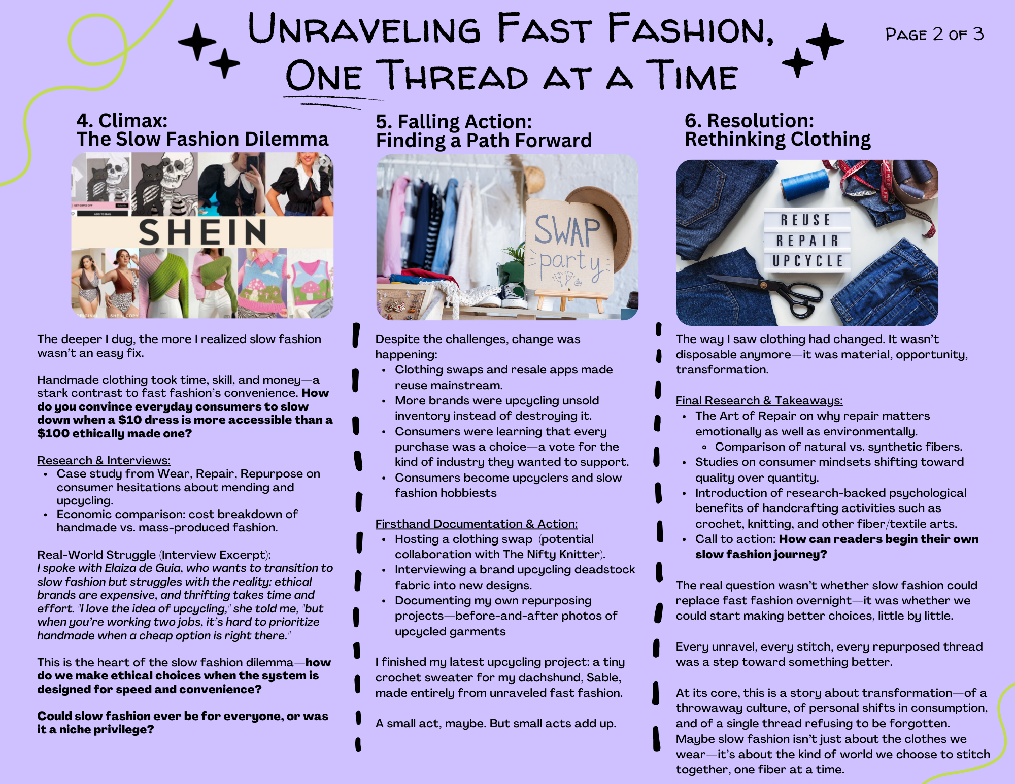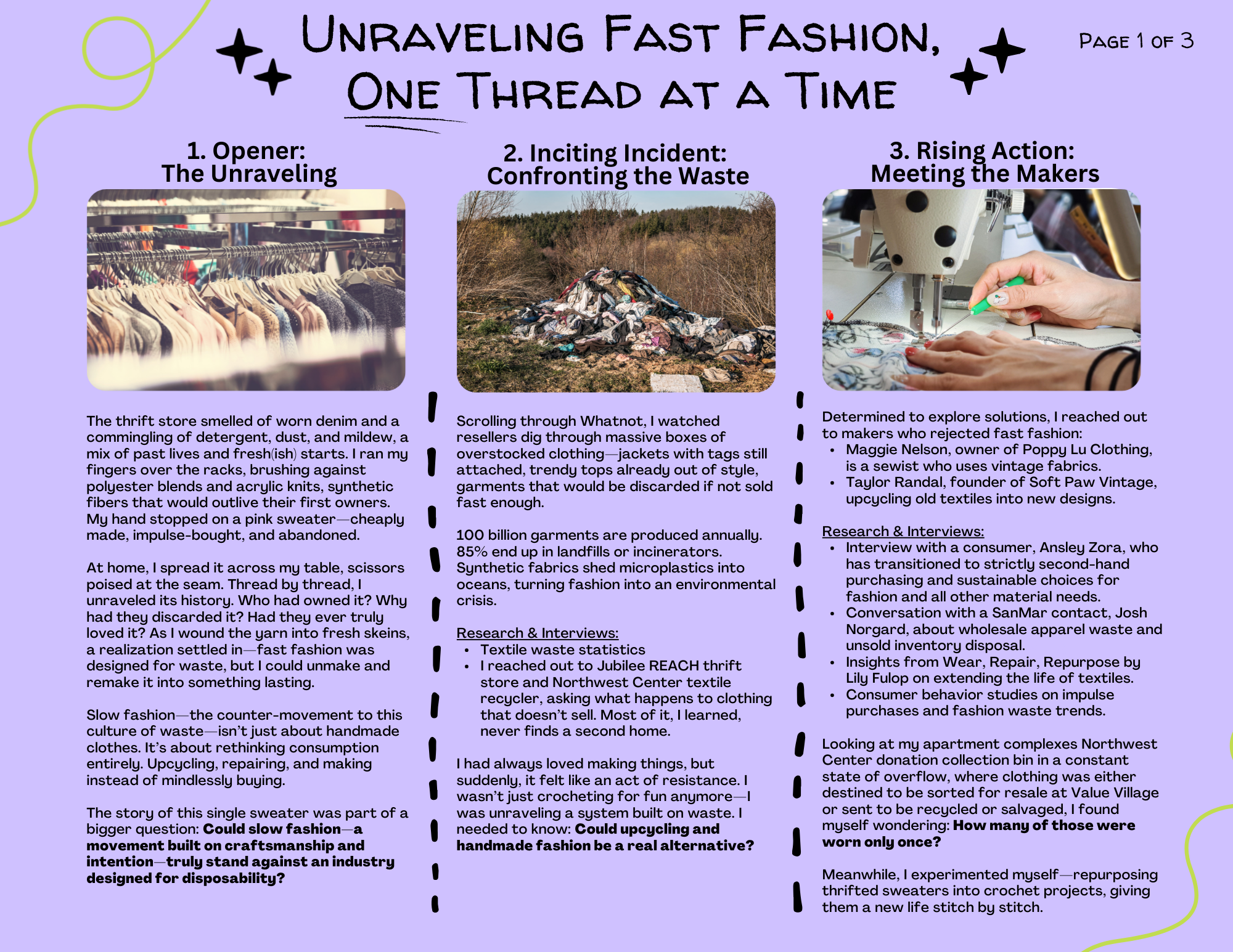 The piece uses a personal experience — unraveling and upcycling a discarded polyester sweater — as the entry point into a broader investigation of the fast fashion industry's environmental and social costs. The storyboard integrates original reporting throughout, including interviews with small business owners Maggie Nelson of Poppy Lu Clothing and Taylor Randal of Soft Paw Vintage, a consumer who has transitioned entirely to secondhand purchasing, and a SanMar wholesale contact on unsold inventory disposal. Supporting research draws on textile waste data, consumer behavior studies and Lily Fulop's book Wear, Repair, Repurpose.